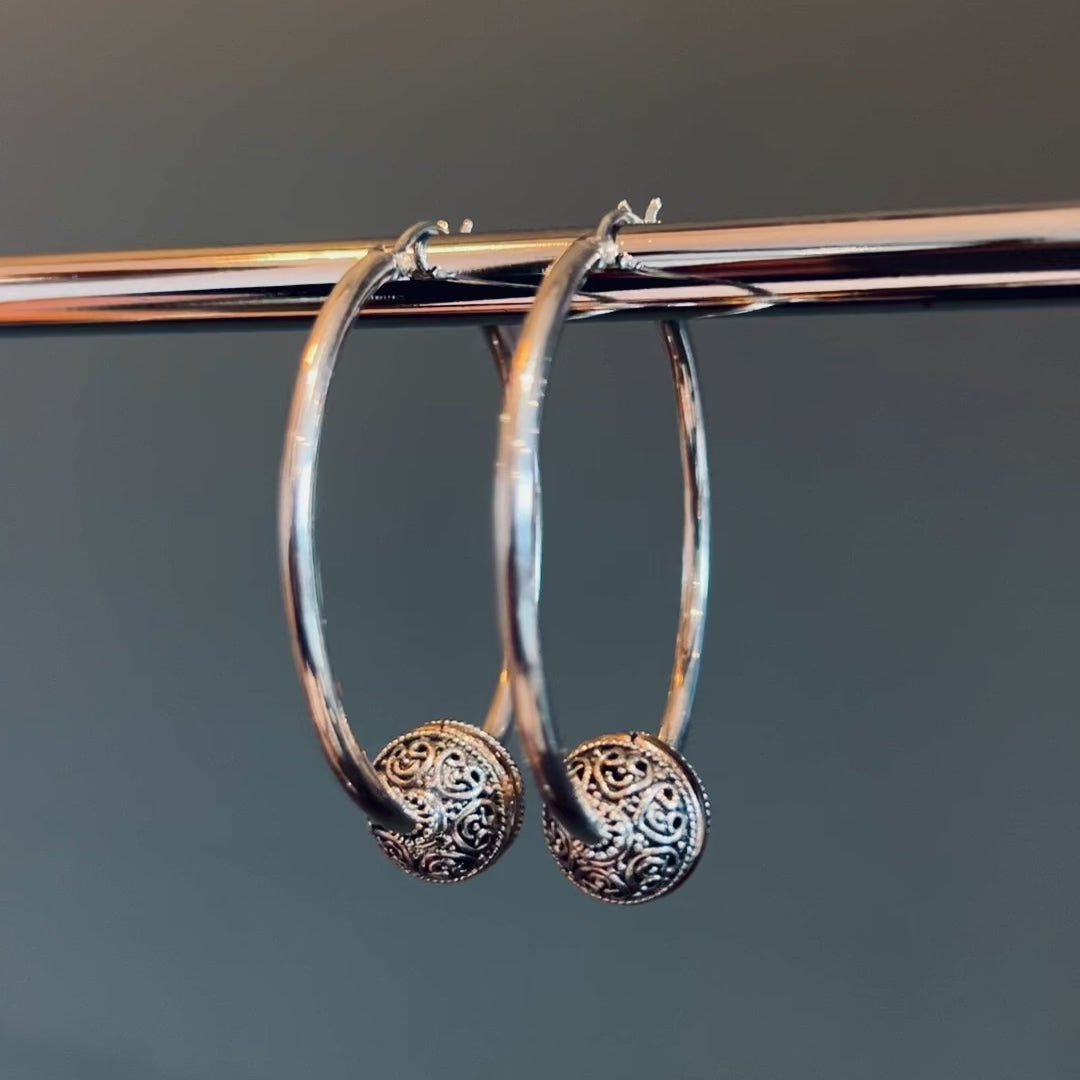 These silver hoop earrings with fabulous intricate disco balls are sure to impress!