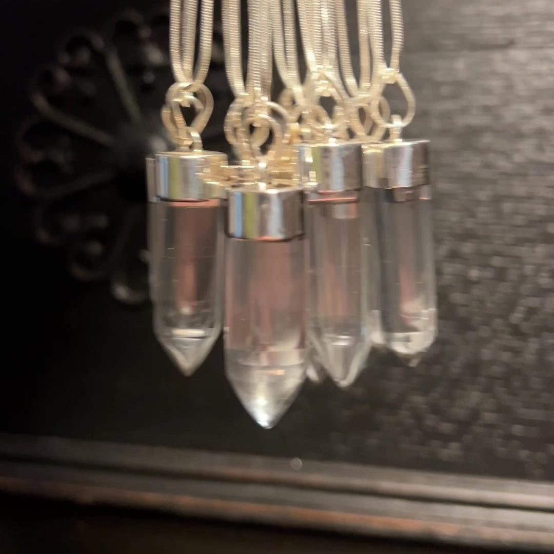 Triple A grade Clear Quartz crystal point, set in a handmade sterling silver pendent, on a lux chain.